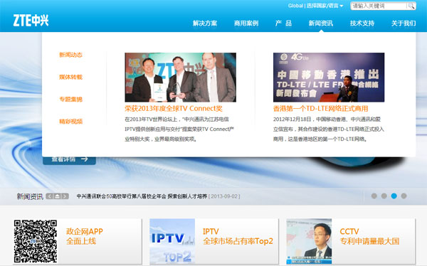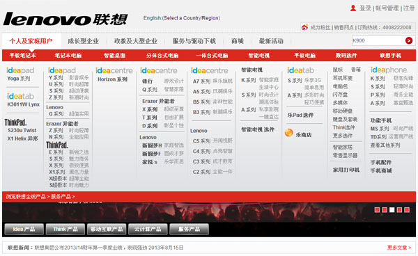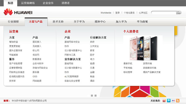 看看下面几个有代表性的中国国际品牌官网,页头导航和页脚导航是目前比较流行的形式。页头导航列出了所有子栏目链接,以及产品、资讯栏目最近更新的内容,不再是以前单调的“下拉菜单”,而是采用隐藏与显示的版块效果。这样,网站最重要的首屏位置,既可以展示有视觉冲击力的大幅广告画面,又可以让页头导航有更大的信息量和吸引力。页脚导航采用纯文字链接展现一、二级栏目,相当于网站地图,既利于搜索引擎抓取,也便于访客清楚整个网站的结构。